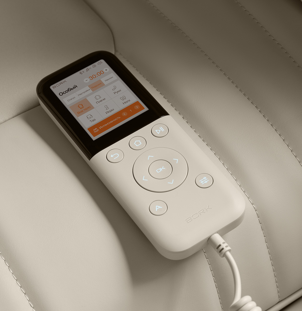 Все управление осуществляется с помощью удобного пульта, на котором можно выбрать вид массажа, угол наклона спинки и блока для ног, активировать прогрев и настроить интенсивность движения роликов.
