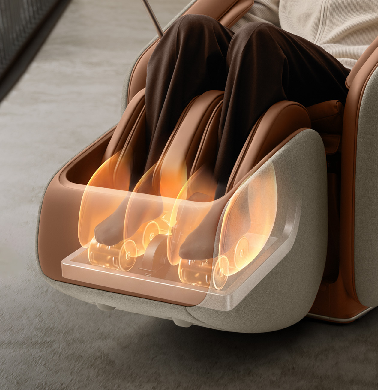 Нижний массажный блок сочетает несколько техник воздействия как на стопы, так и на икры: компрессионный массаж с воздушными подушками, роликовый массаж с подогревом или вибромассаж.